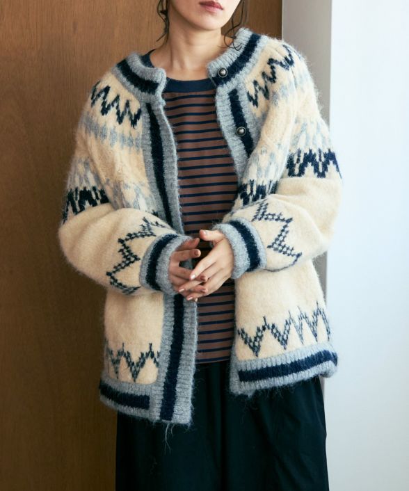 ・ノルディックニットカーデの柄、編みを新たに復刻 ・古着をイメージしたカラー配色でカジュアルな印象に ・ふわっとした起毛感のある素材と肉厚な手触りが、冬でも暖かみのある着心地 ・中に着込めるオーバーサイズも○ ・裏地付きでアウターとして活躍します