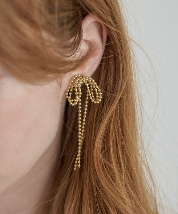 ・小粒なボールチェーンでリボンをかたどったデザイン ・艶感のあるゴールドカラー ・繊細で華奢なディテールで存在感があり、顔周りに華やかさをプラス