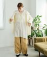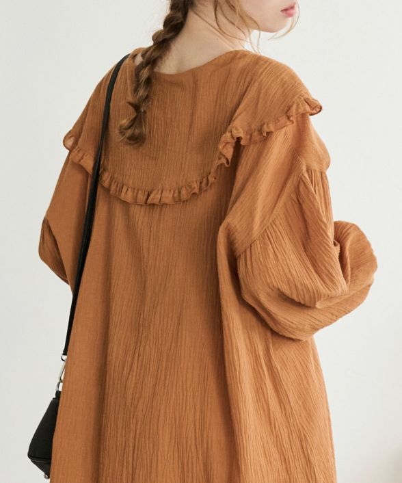 レトロなビッグカラーが目を惹くチュニック。 存在感のあるビッグカラーが大人かわいく着映えする1枚です。 フリルデザインで甘めな印象ながらも、首元のあきやサイドスリットで抜け感を出し大人っぽく着られるデザインに。 ふんわりとしたボリュームスリーブはコーディネートに立体感をプラスします。 首元のリボンは結ぶのはもちろん、垂らしてこなれ感のある着こなしも◎ デニムと合わせてカジュアルな着こなしはもちろん、ラフパンツやジョガーパンツとのラフなスタイリングもおすすめです。