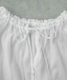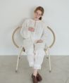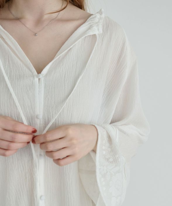 同シリーズのドロワーズパンツを合わせたセットアップでの着こなしがおすすめです。 前後2way仕様でトップスとしても羽織りとしてもマルチな着こなしが叶います。 ハーフパンツとラフなスタイルや、デニム合わせでカジュアルにも、合わせるアイテムを選ばずに着回せる1枚。 襟元のリボンは結ばずに敢えて垂らして着こなすのも◎