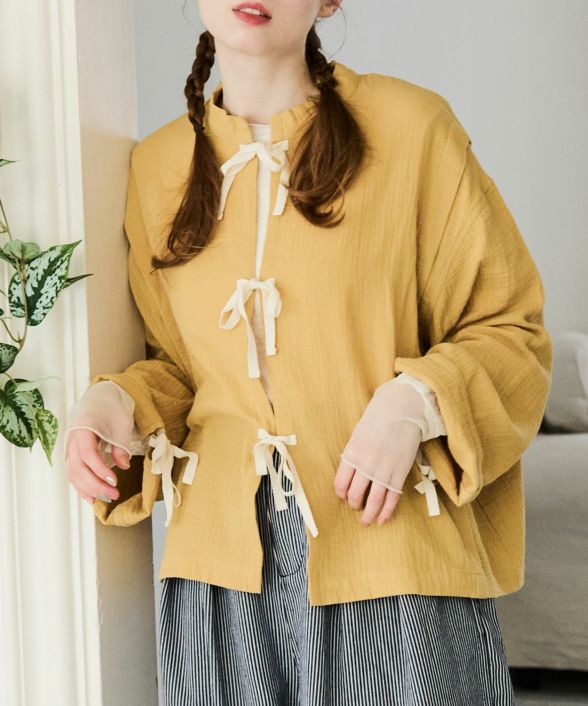 【ダブルガーゼの優しい風合いがポイント、リボンデザインが目を惹くナチュラルブラウス】