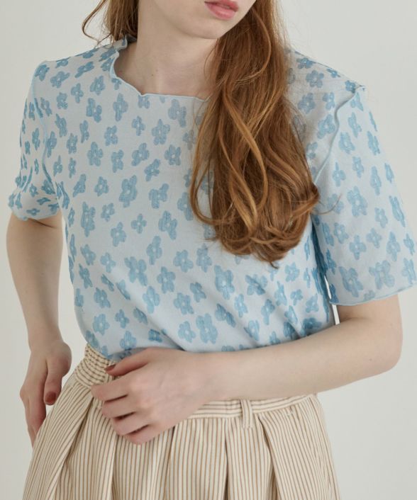 ・フラワーメロウロングスリーブTシャツ[c1R3591]の半袖ver. ・華やかな総柄が目を惹く1枚 ・透け感のあるオーガンジーが重なった花柄がポイントに◎ ・ボディはベーシックな形で作っているので、かわいらしくなり過ぎず大人カジュアルに着られます ・胸囲や袖をゆるめに作っているので1枚でもさらっと着て頂けるアイテム ・薄手で肌離れが良いので涼しく着られる素材感