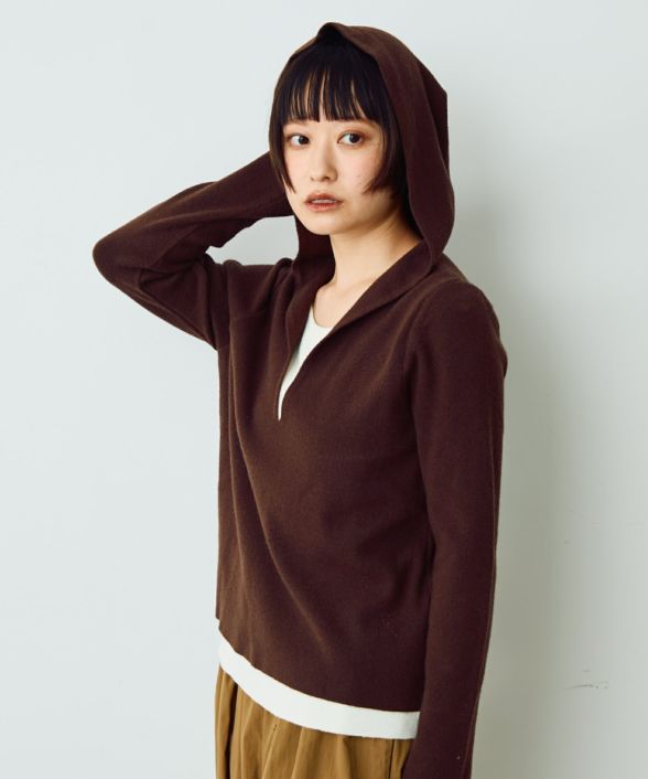 【深めのVネックにフードが付いたカジュアルな雰囲気のニットプルオーバー】