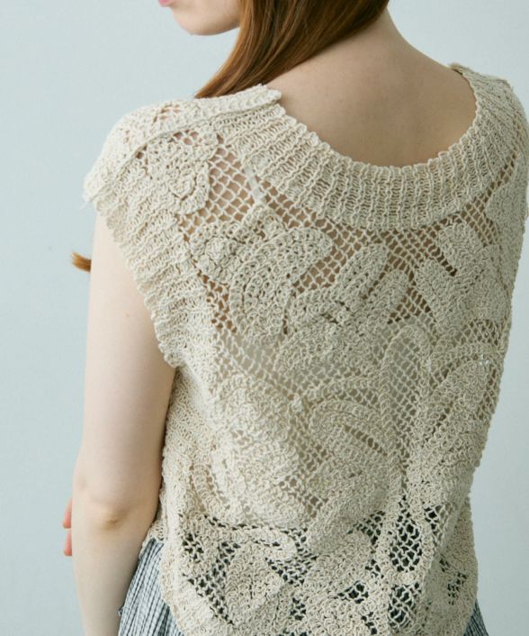 ・メッシュ編みと大胆なフラワーモチーフがポイント ・ゆったりめのネックデザインと、ラウンドヘムが女性らしい柔らかな雰囲気を演出 ・コンパクトなサイズ感が様々なボトムとの相性◎ ・ナチュラルな素材感が夏らしさを感じさせる一枚