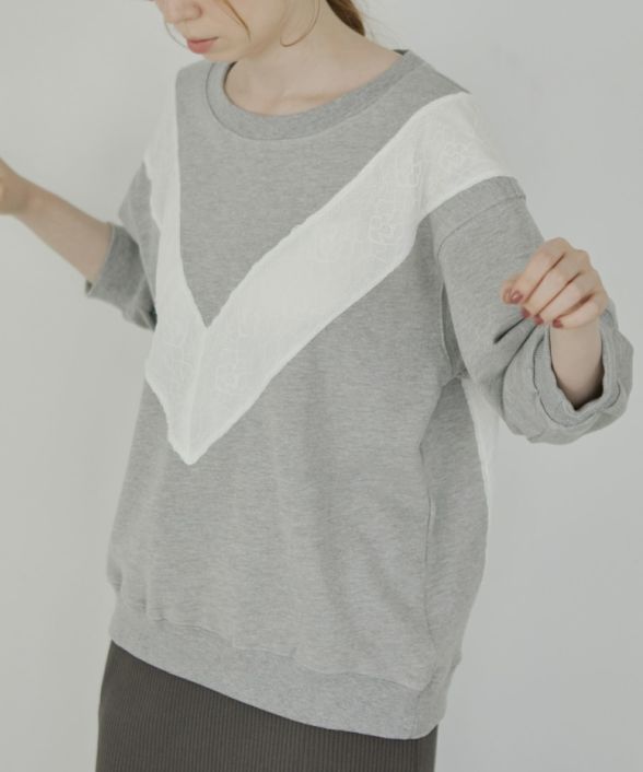 ・切り替え部分のレースはシフォンを当てているので、透け感を気にせず着られるデザイン ・ゆったりシルエットながら手首が見える袖丈で華奢見えが叶う1枚 ・着心地の良い程よい厚みの裏毛素材を使用しており、ロングシーズン着用できます