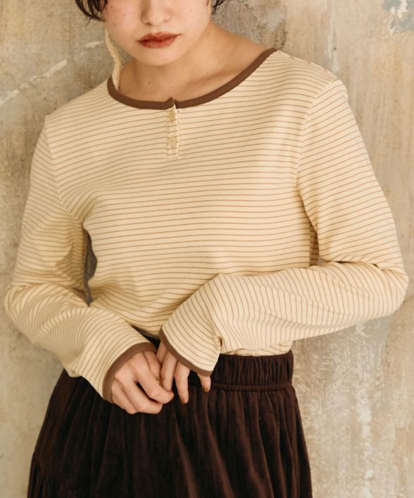・アイボリーカラーをベースに秋らしいカラー配色のボーダー ・バイカラーの衿ぐりがアクセント、細めのパイピングが華奢な印象をプラス ・さりげないヘンリーデザインでカジュアさも○ ・伸縮性が良く、程よい厚みのあるリブ生地を使用し、ストレスフリーな着心地に