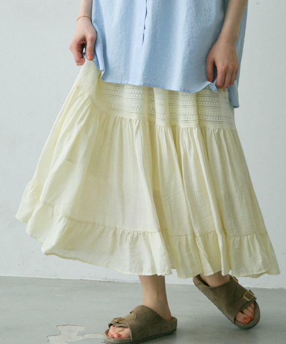 ・シルエットがきれいに見えるバランスの良いティアード切り替え ・切り替え部分には幅広レースをあしらって華やかな印象に ・ウエストはゴム仕様ですっきり見せ、ラフな着心地に ・やや光沢感のある大人っぽいレーヨン素材を使用、裏地付きで透けづらいのも◎