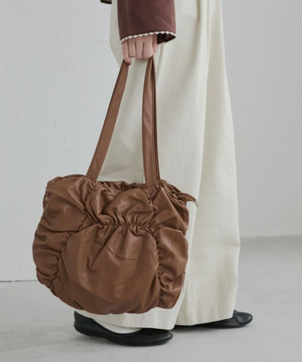 ・たぽっとしたボリューム感のあるシルエットでシャーリングデザインがポイント ・柔らかい手触りと軽さが特徴、太めのハンドルで肩馴染みの良さも◎ ・内側には小物を収納できるファスナーポケット付き ・バッグ口にもファスナー付きで中身の見えない安心仕様
