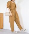 1枚でスタイリングが完成するオールインワン。 ウエストマークされたシルエットとボリューム感のあるパフスリーブが女性らしくポイントになります。 リラックス感がありながらも程よく上品さがあり大人っぽく着ていただける1枚。 Vネックで顔周りがすっきりと見えるのも嬉しいポイント。 バックファスナー付きで着脱しやすいのも◎ 足元にはスニーカーを合わせてカジュアルダウンさせたスタイルや、サンダルとのこなれ感漂う着こなしもおすすめです。 日常使いはもちろん、きれいめなシーンでも活躍するので、ワードローブに1枚あると重宝する万能アイテムです。