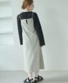 ・こなれ感のあるスタイルが叶うシルエットが魅力 ・華奢な肩紐を後ろで結ぶバックリボンデザイン、肩紐の長さ調節も可能 ・裾に向かって広がるひかえめなAラインがボディラインを拾わず体型カバー ・後ろ裾はバックスリットを施し抜け感をプラス、歩きやすさも◎ ・デニム生地とツイル生地を使用、合わせるインナーでオールーシーズン着回せるシーズンレスな素材感