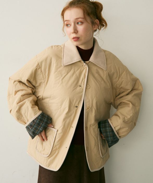 ・軽い着心地が魅力のキルティングジャケット ・衿とパイピングにはコーデュロイ生地を使用し、異素材を組み合わせワンカラーでまとめた1枚 ・裏地は起毛のチェック生地で暖かみのある作りに ・袖口を折り返してチェック柄を見せても○