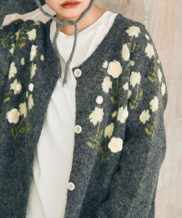 ・花柄部分に施したポンポンや花モチーフの細かなディテールがポイント ・ラグラン袖のゆったりしたシルエットで肩のラインが気にならないデザイン ・チクチク感のない肌触りの良い生地感でストレスフリーな着心地 ・杢調のやわらかなカラーでナチュラルな雰囲気に