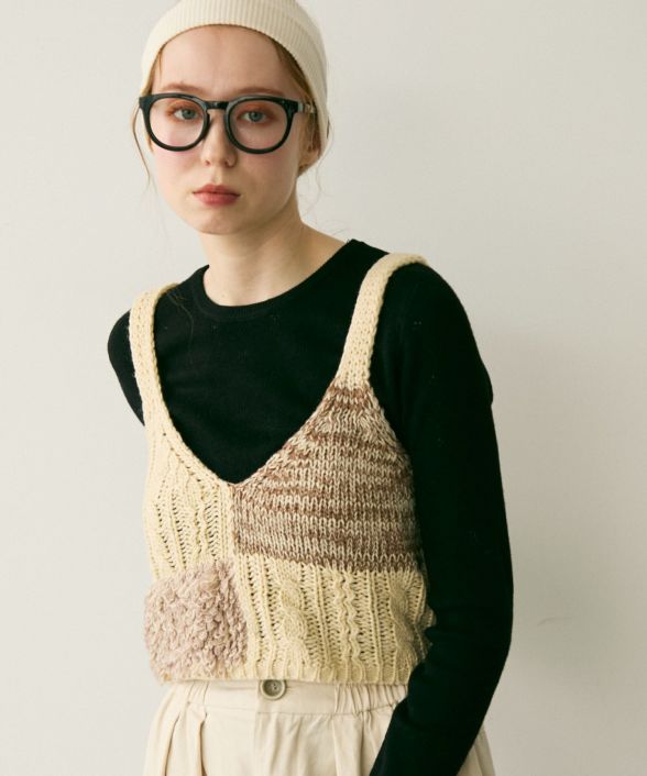 【ニュアンスカラーとパッチワーク柄の組み合わせが目を惹くニットビスチェ】