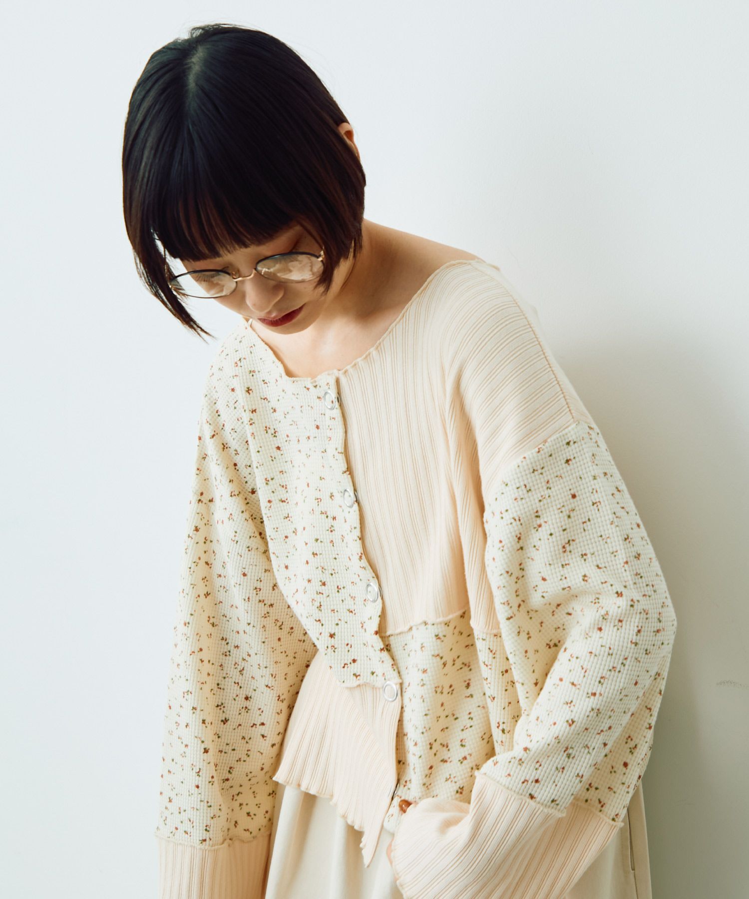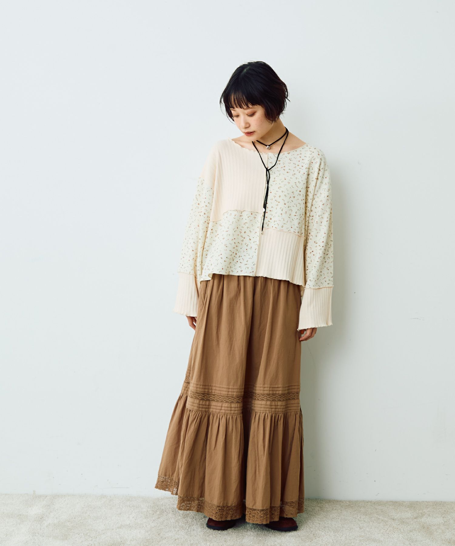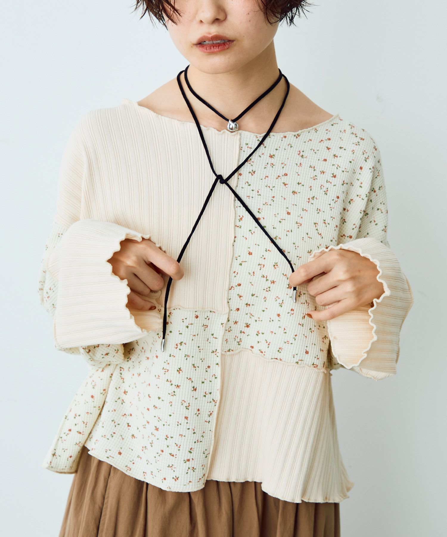 フラワーリブパッチワークトップス[c1R3780]