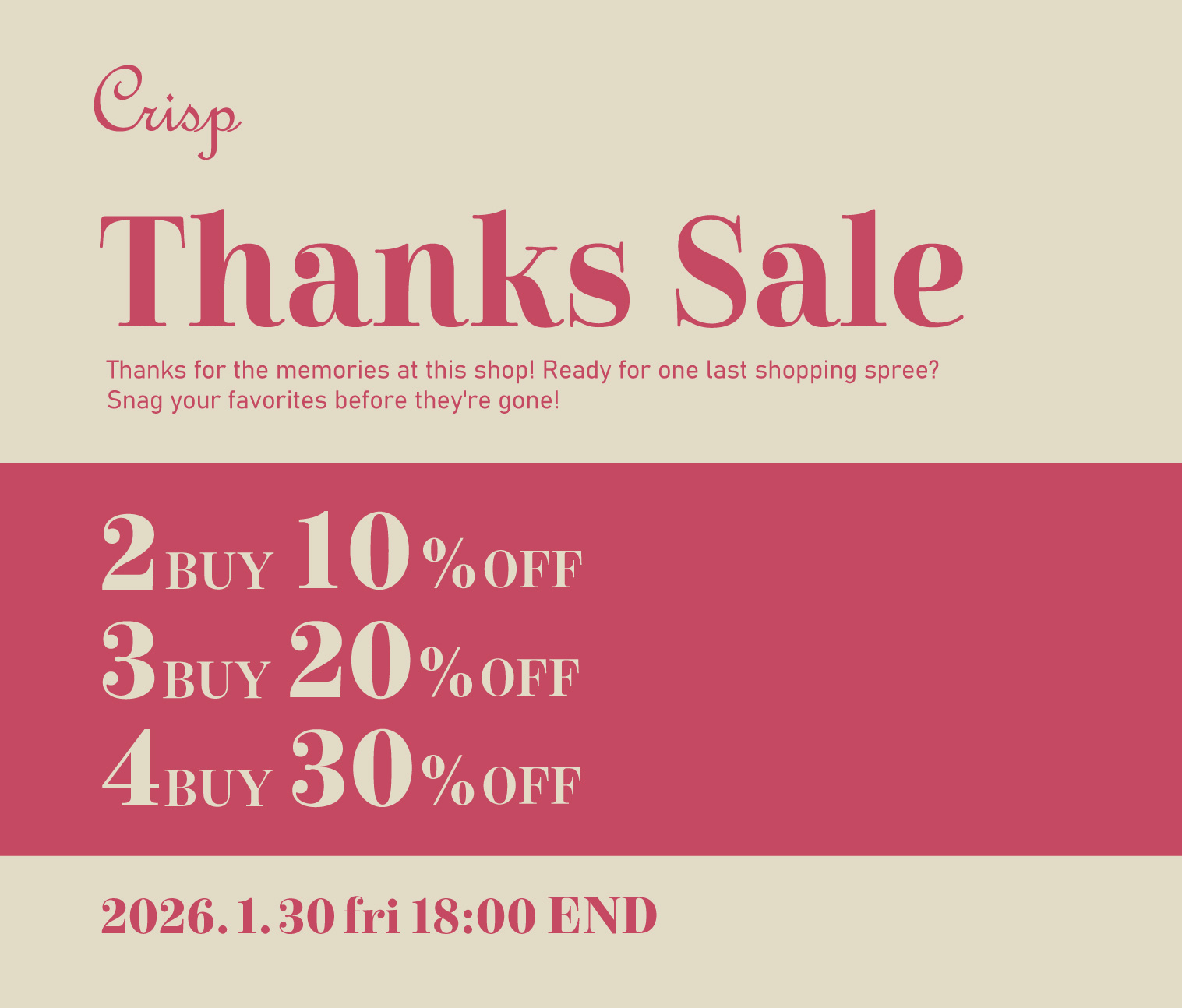 公式ONLINE SHOP営業終了に伴い、最終注文受付は1月30日(金)18:00までとなります。