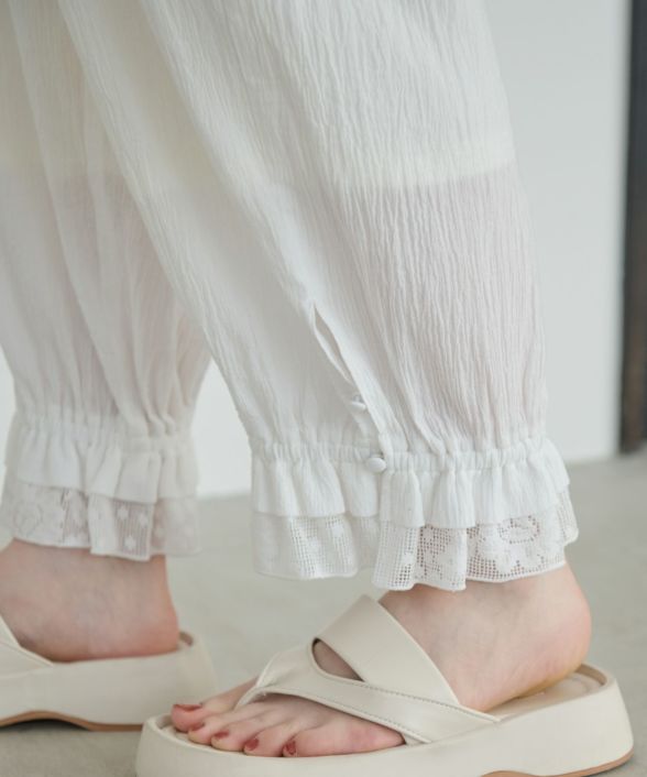 【裾のフリルディテールがポイントのノスタルジックなドロワーズパンツ】