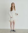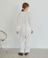 同シリーズのドロワーズパンツを合わせたセットアップでの着こなしがおすすめです。 前後2way仕様でトップスとしても羽織りとしてもマルチな着こなしが叶います。 ハーフパンツとラフなスタイルや、デニム合わせでカジュアルにも、合わせるアイテムを選ばずに着回せる1枚。 襟元のリボンは結ばずに敢えて垂らして着こなすのも◎