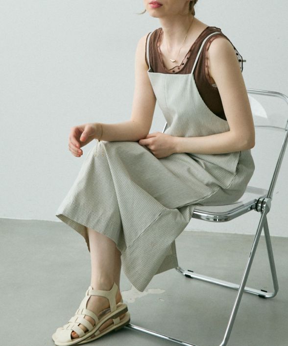・こなれ感のあるスタイルが叶うシルエットが魅力 ・華奢な肩紐を後ろで結ぶバックリボンデザイン、肩紐の長さ調節も可能 ・裾に向かって広がるひかえめなAラインがボディラインを拾わず体型カバー ・後ろ裾はバックスリットを施し抜け感をプラス、歩きやすさも◎ ・デニム生地とツイル生地を使用、合わせるインナーでオールーシーズン着回せるシーズンレスな素材感
