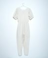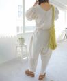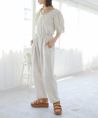 1枚でスタイリングが完成するオールインワン。 ウエストマークされたシルエットとボリューム感のあるパフスリーブが女性らしくポイントになります。 リラックス感がありながらも程よく上品さがあり大人っぽく着ていただける1枚。 Vネックで顔周りがすっきりと見えるのも嬉しいポイント。 バックファスナー付きで着脱しやすいのも◎ 足元にはスニーカーを合わせてカジュアルダウンさせたスタイルや、サンダルとのこなれ感漂う着こなしもおすすめです。 日常使いはもちろん、きれいめなシーンでも活躍するので、ワードローブに1枚あると重宝する万能アイテムです。