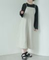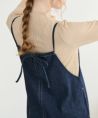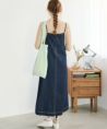 ・こなれ感のあるスタイルが叶うシルエットが魅力 ・華奢な肩紐を後ろで結ぶバックリボンデザイン、肩紐の長さ調節も可能 ・裾に向かって広がるひかえめなAラインがボディラインを拾わず体型カバー ・後ろ裾はバックスリットを施し抜け感をプラス、歩きやすさも◎ ・デニム生地とツイル生地を使用、合わせるインナーでオールーシーズン着回せるシーズンレスな素材感