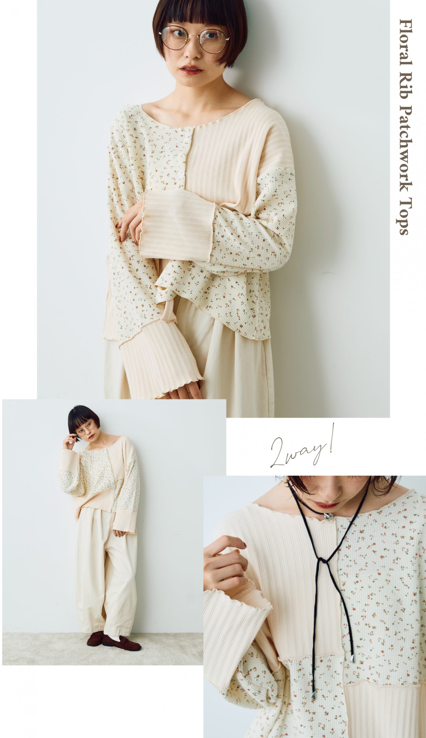 フラワーリブパッチワークトップス