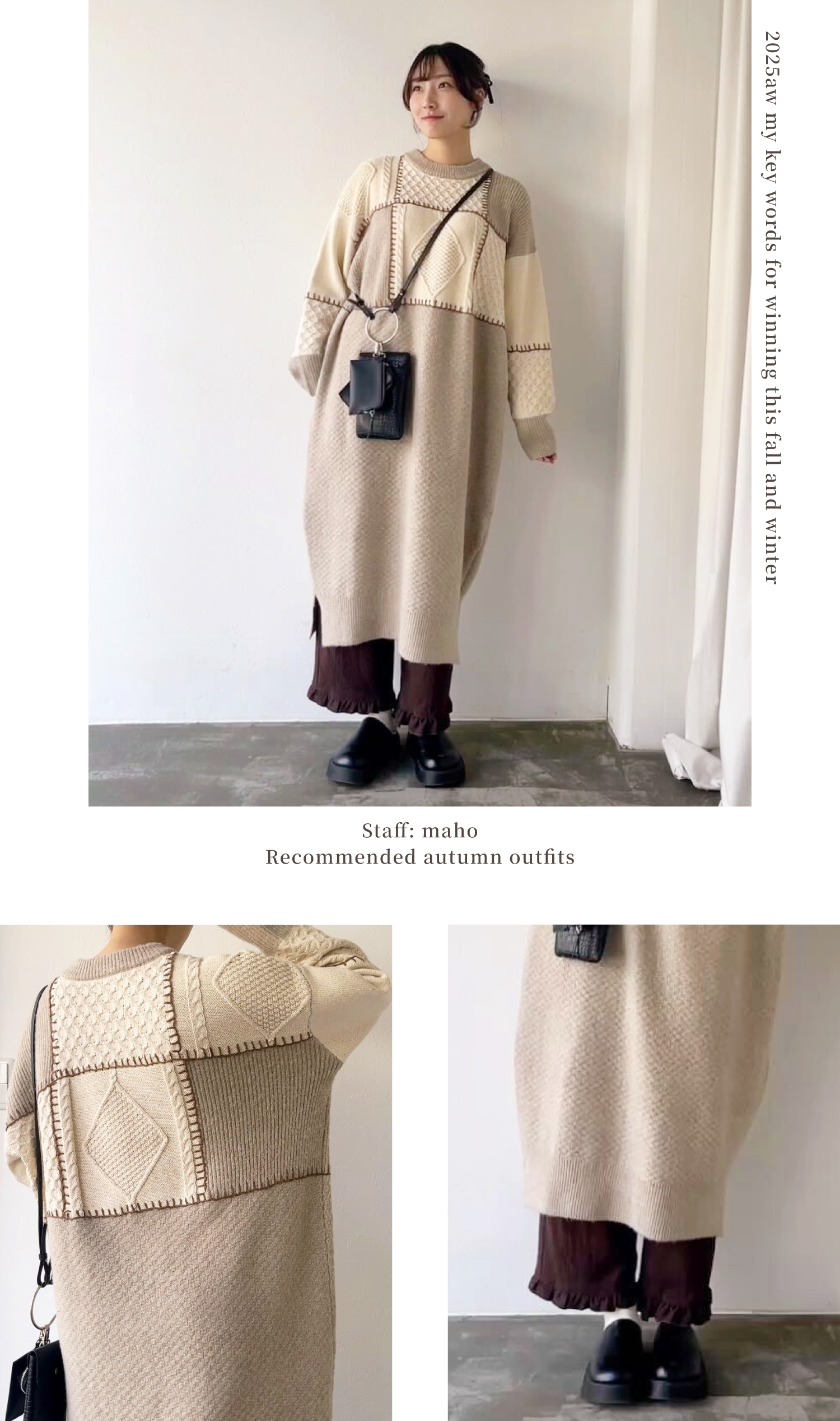 バイカラーのステッチが魅力的なパッチワークニットワンピ!