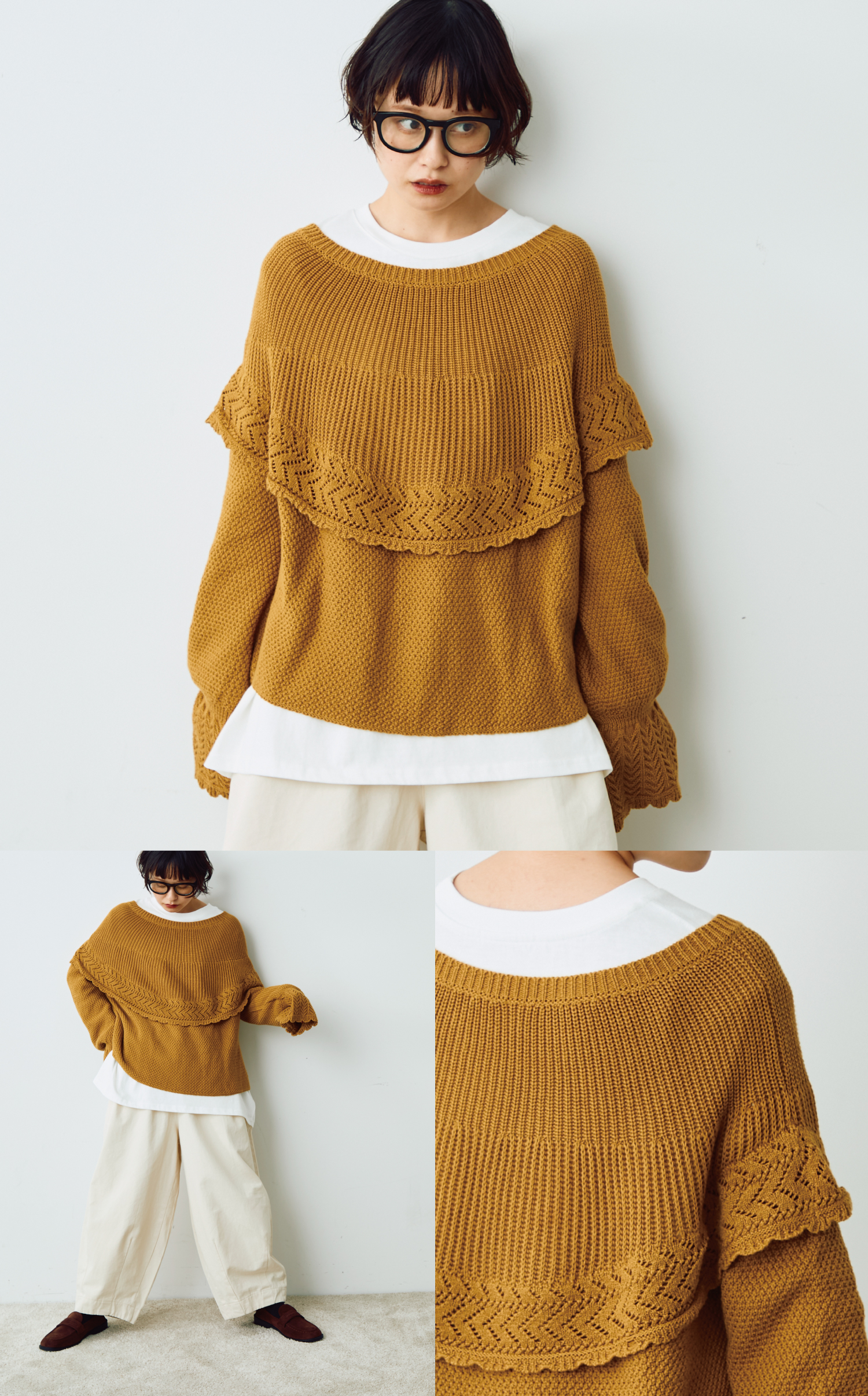 胸元のフリルデザインが目を惹くショートニット。