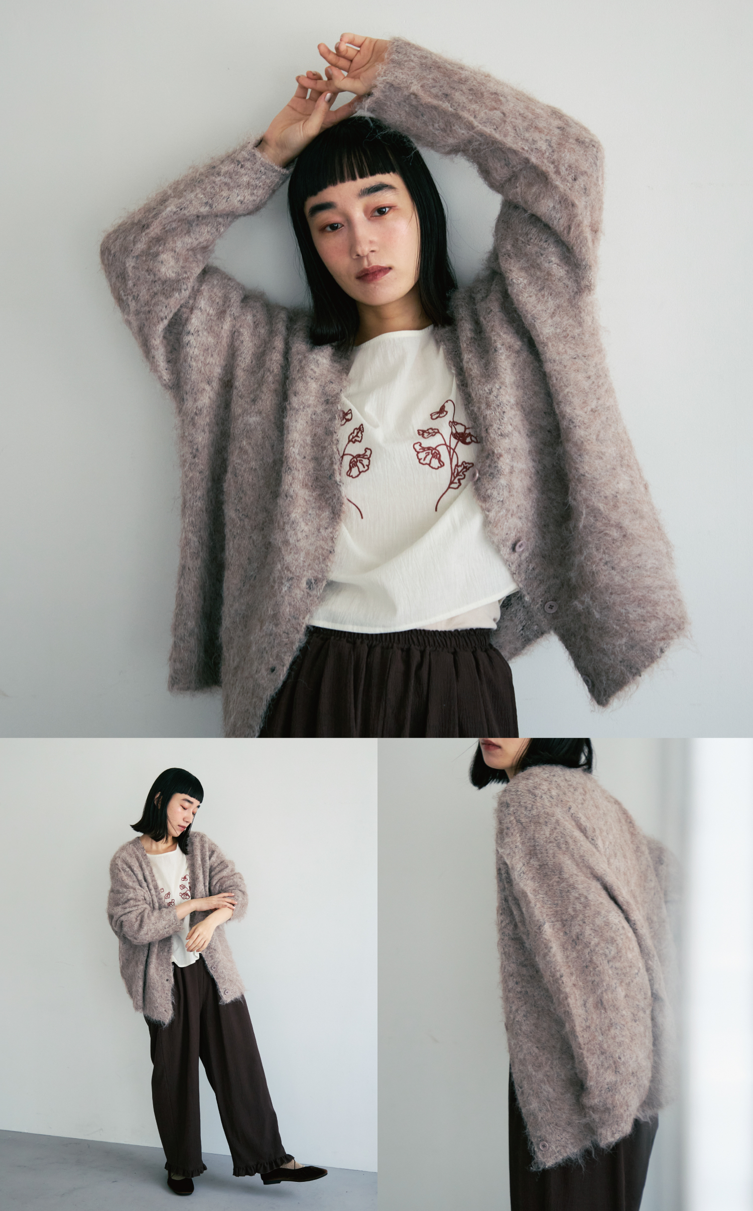 ふんわり優しい印象になるミックス糸を使用。