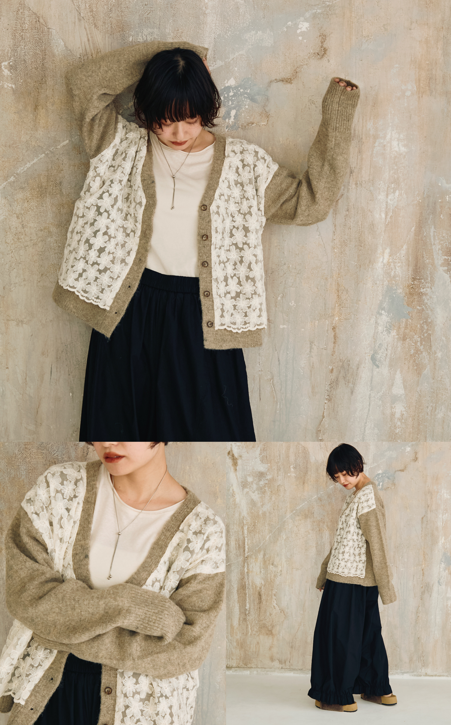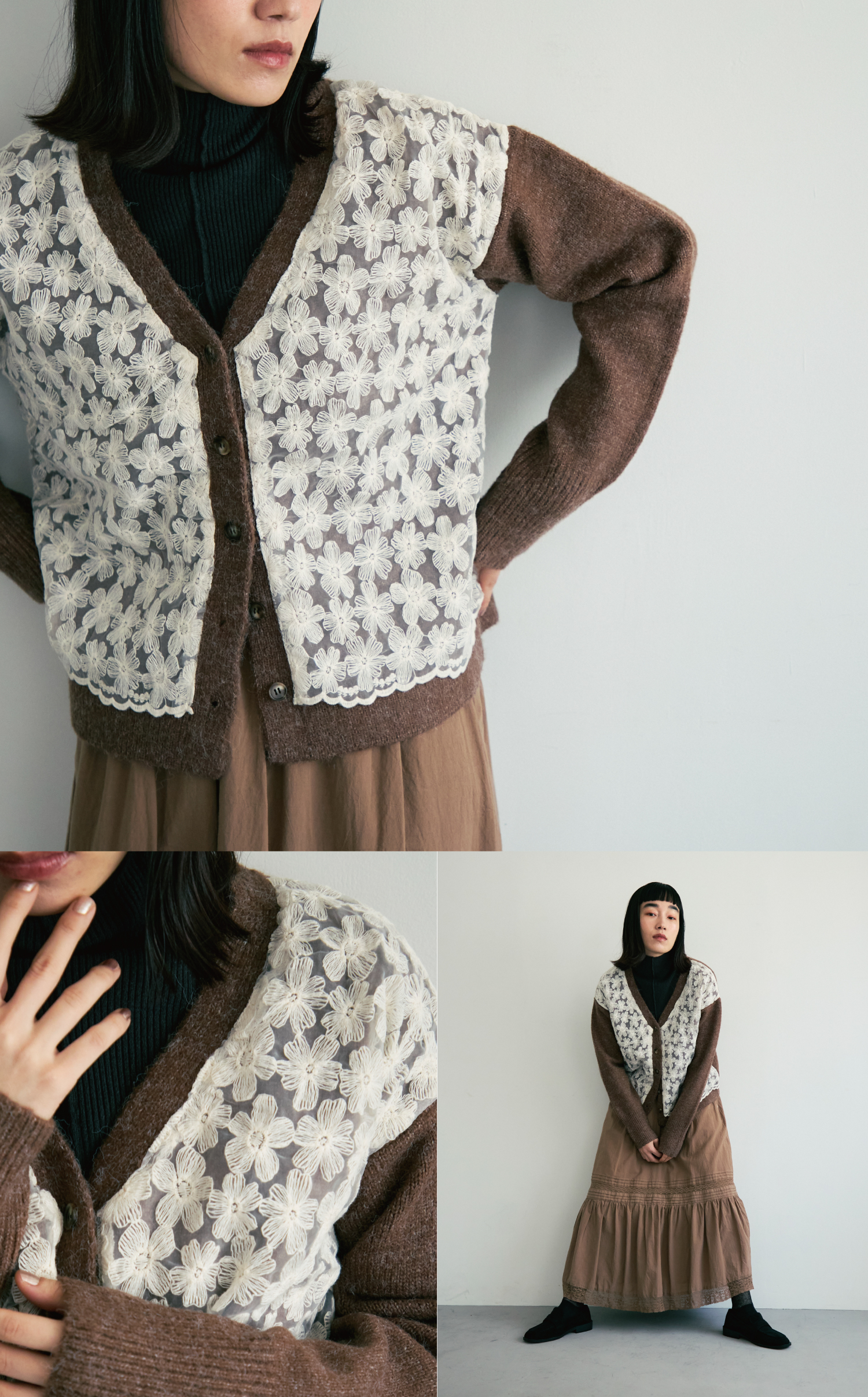 フラワー刺繍のレースを重ねたニットカーディガン。