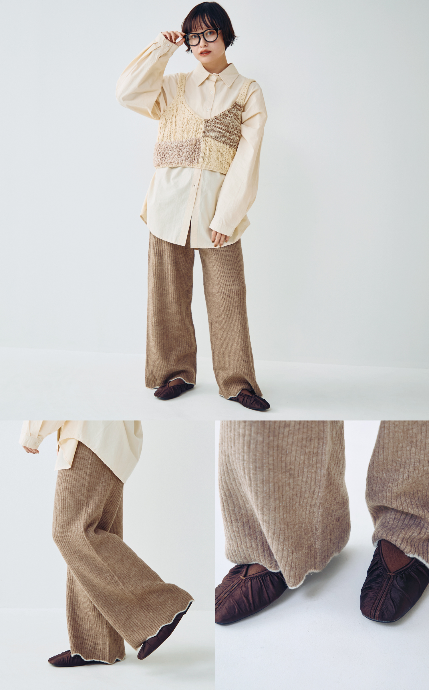 バイカラーのウェーブヘムがアクセントのニットパンツ。